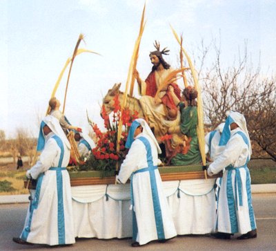 En sus orígenes la indumentaría de la Cofradía de "La Entrada de Jesús en Jerusalén" constaba de una túnica de color beige con franjas verticales azul celeste, acompañada de tercerol blanco corto con la cara cubierta con máscara del mismo color azul. Con el paso del tiempo la túnica ha pasado de ser beige a ser blanca por cuestiones estéticas, con lo que se ha renovado el vesturaio de todos los cofrades, ganando en vistosidad.