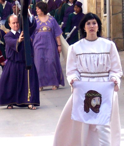 Y por último, y también relacionada con la familia Laguna, existe otra individualidad, la "Verónica". La Verónica representa a la mujer que secó el rostro de sudor a Jesucristo durante el camino hacia el calvario. En La Puebla de Híjar, delante de la cruz, siempre sale una mujer con vestido de apariencia hebrea, portando un pañuelo en el que puede verse el rostro de Jesús. La tradición desconozco quién la empezó, lo que sé es que la continuó Florinda Esteban, hija de José Esteban (el que fuera segundo portador de la cruz como se ha comentado anteriormente), y la llevó a cabo durante muchos años. Hoy en día su hija Carmen Granel le ha tomado el relevo y representa a la Verónica durante la procesión del Pregón todos los Jueves Santos.