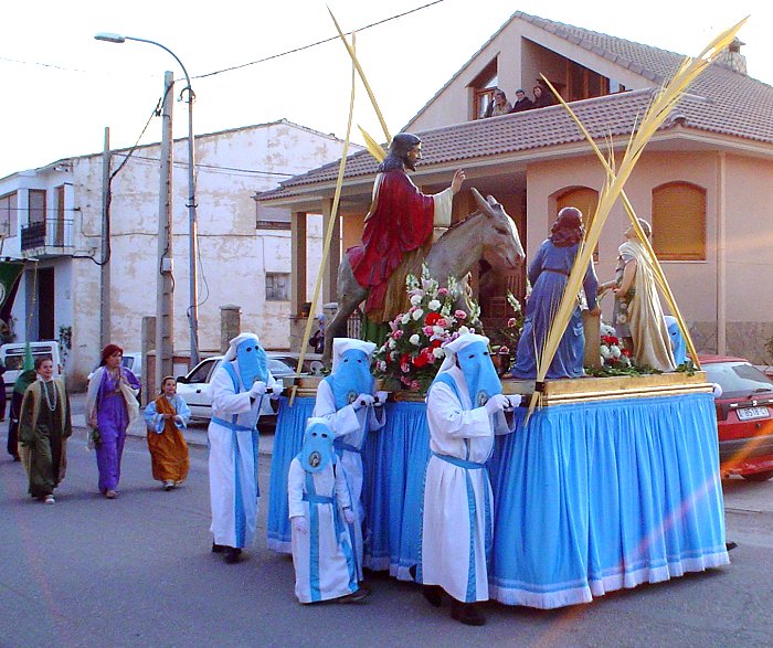 En sus orígenes la indumentaría de la Cofradía de "La Entrada de Jesús en Jerusalén" constaba de una túnica de color beige con franjas verticales azul celeste, acompañada de tercerol blanco corto con la cara cubierta con máscara del mismo color azul. Con el paso del tiempo la túnica ha pasado de ser beige a ser blanca por cuestiones estéticas, con lo que se ha renovado el vesturaio de todos los cofrades, ganando en vistosidad.